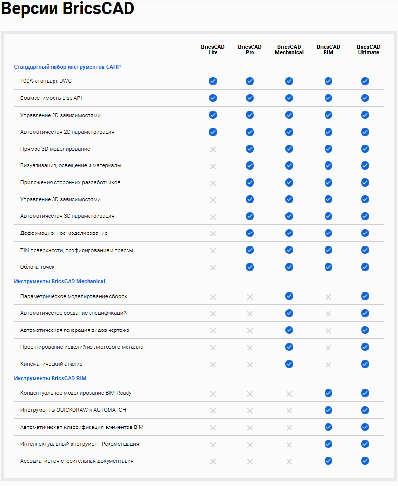 Полезная информацияСравнение возможностей редакций BricsCAD Lite, Pro, Mechanical, BIM и Ultimate. Что такое BricsCAD Pro?BricsCAD Pro – самый массовый и универсальный продукт в нашей линейке. Отточенные десятилетиями инструменты 2D черчения идеально сочетаются с инновационными технологиями вариационного прямого 3D моделирования и полнофункциональным API для взаимодействия со сторонними приложениями. BricsCAD Pro может использоваться как универсальная 2D/3D DWG САПР, так и как платформа для сотен плагинов и вертикальных приложений, стирающих границы возможностей комплекса. Активно растущие возможности 3D моделирования делают BricsCAD Pro самой функциональной 3D системой в мире DWG и значительно превосходят возможности AutoCAD и его клонов. Более того, на платформах Linux и Mac BricsCAD Pro не имеет даже отдаленных аналогов.