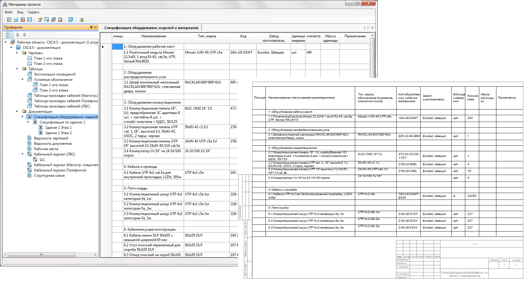 - автоматическое составление отчетных документов (спецификация, кабельные журналы, схемы компоновки монтажных конструктивов, структурная схема, таблицы прокладки кабелей);