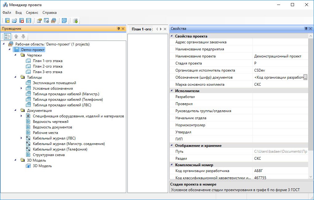 Одним из факторов успешного выполнения проекта является доступ к проектной информации. Работа в Project StudioCS СКС построена вокруг инструмента Менеджер проекта – фактически центральной базы данных, которая содержит чертежи, автоматически формируемые отчеты и результаты расчетов, а также позволяет собрать все необходимые документы для выполнения проекта (техническое задание, пояснительные записки и т.п.). Также Менеджер проекта позволяет использовать привязанные к производителям базы оборудования и управлять доступом к ним, обеспечивает назначение и перенастройку под проект параметров оборудования, максимально детализируя проект и организуя коллективную работу отдела (группы) проектирования с едиными согласованными данными.