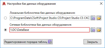 Также реализована возможность организовать для группы пользователей общую сетевую библиотеку баз данных оборудования, которую можно разместить на сервере и указать к ней путь. При запуске программы в фоновом режиме происходит синхронизация локально расположенных баз данных пользователя с сетевой. Это позволяет группе пользователей применять общие базы данных производителей с возможностью полноценной работы при отсутствии подключения к сетевой библиотеке.