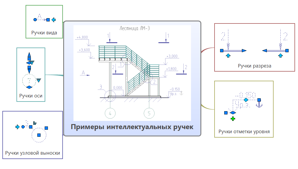 Для упрощения работы над проектами в СПДС GraphiCS предусмотрен набор объектов, которые отражают массивы осей, выноски, отметки и другие виды обозначений. Эти элементы можно использовать при оформлении всех видов электронной документации. Реализован механизм работы с отдельными фрагментами чертежей без масштабирования изображений и создания большого количества стилей.