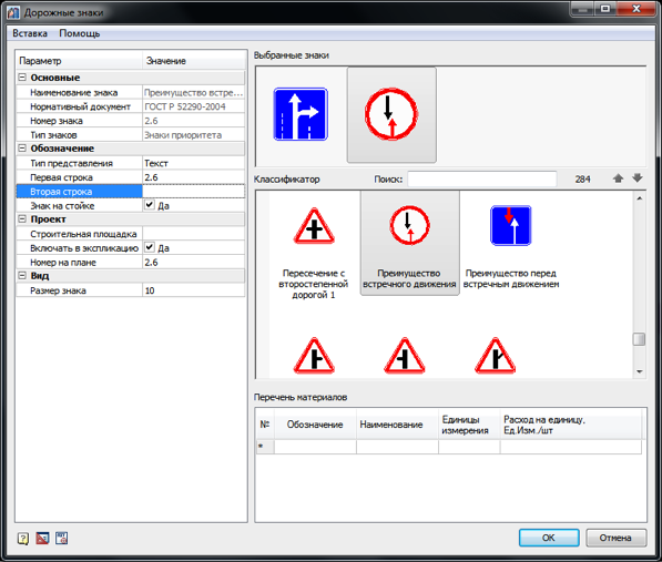 СПДС Стройплощадка содержит базу дорожных знаков по ГОСТ Р 52290-2004 и знаков безопасности по ГОСТ Р 12.4.026 2001. На основании чертежа строится обновляемая спецификация дорожных знаков, рассчитывающая их общее количество.