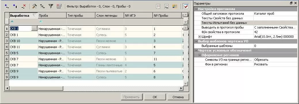 Результаты работы в подсистеме могут быть оформлены в виде каталога выработок различных форматов и ряда ведомостей или чертежей условных обозначений: грунтов, опробований, литологических особенностей и других. Есть возможность настройки собственных ведомостей.