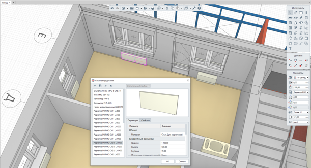 Вместе с тем, в случае необходимости, есть возможность импорта в модель трехмерных объектов, которые инженер сможет использовать в создаваемой модели. Для этого предусмотрена интеграция системы с другими программными продуктами и импорт в форматах .ifc, .c3d, . step, .sat, .iges и др. Помимо этого, в Renga представлены готовые каталоги ведущих производителей инженерного отопительного оборудования.